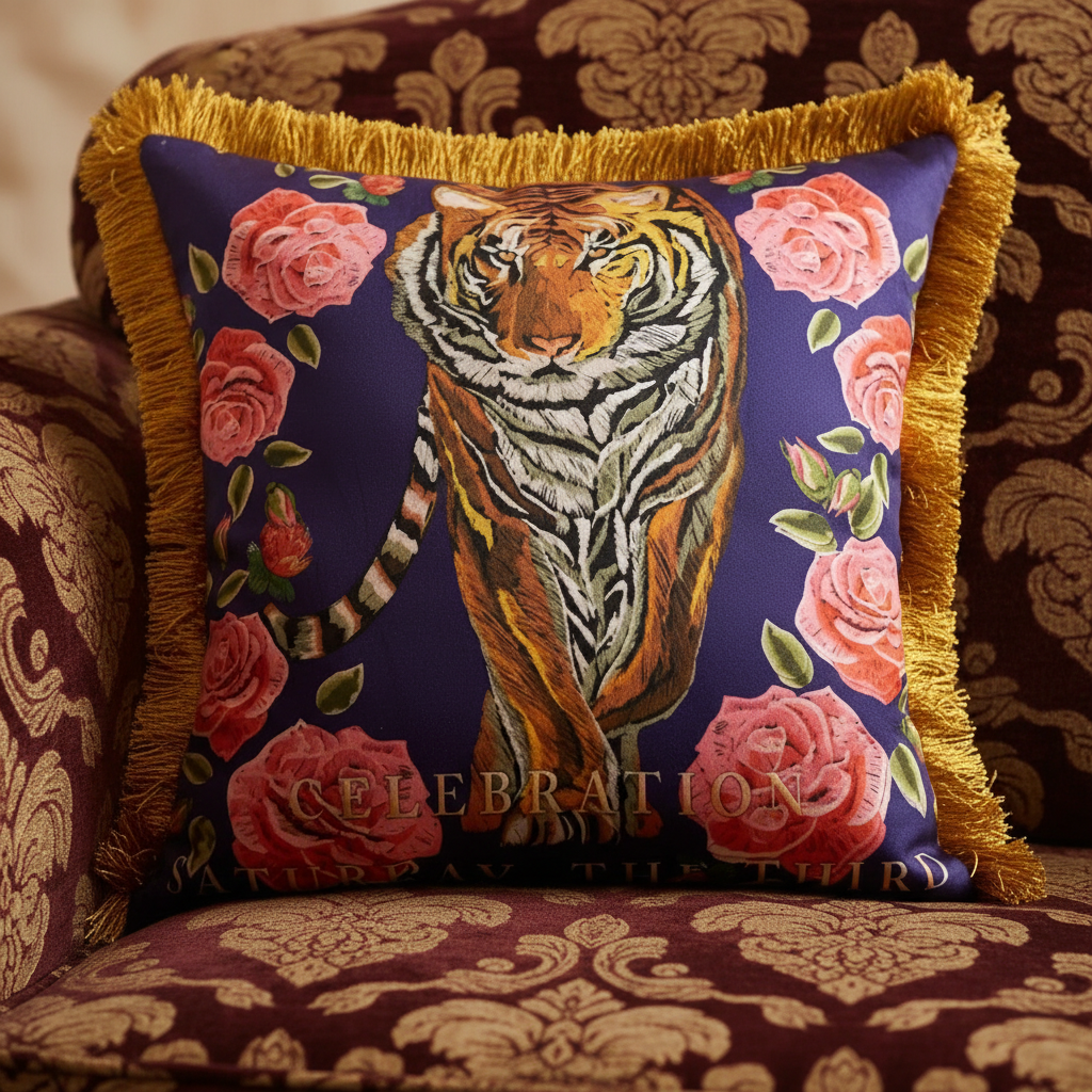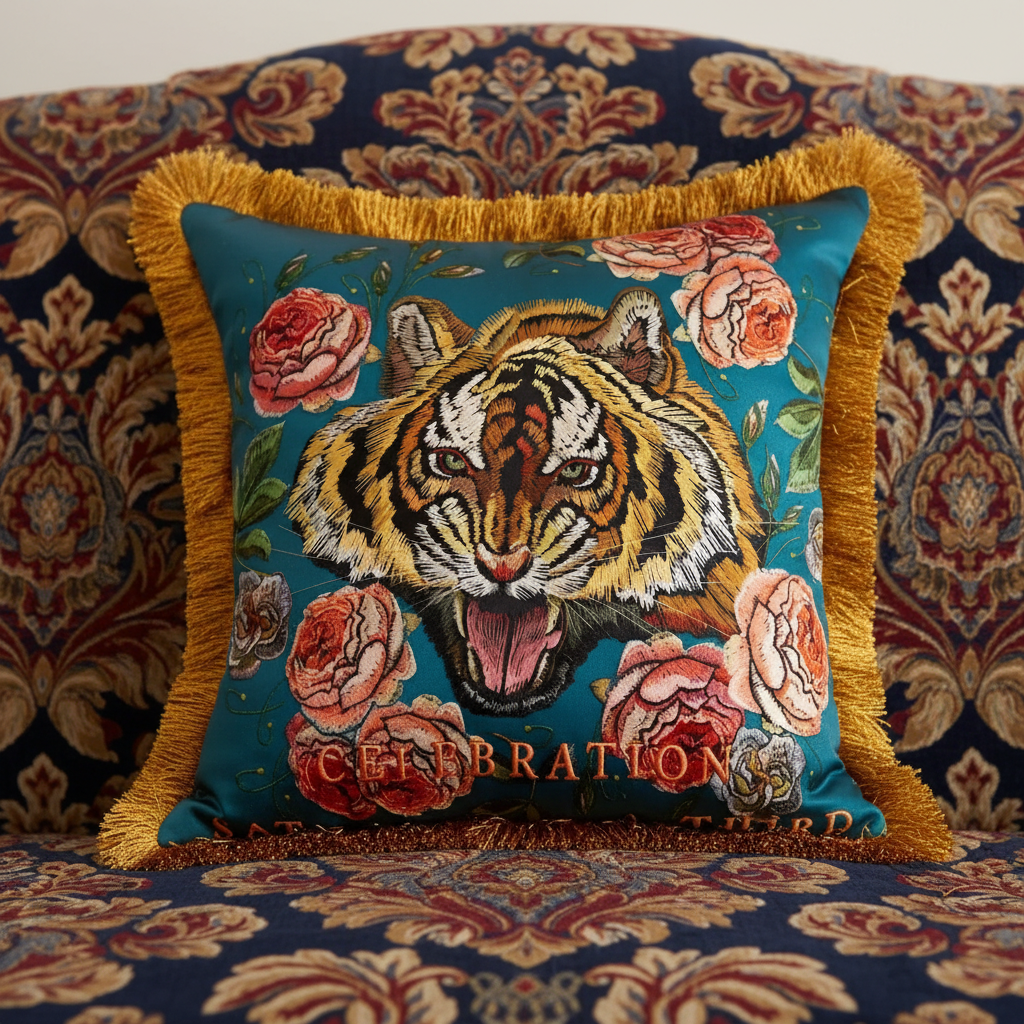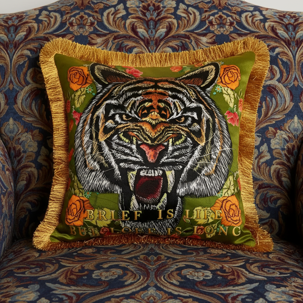 Embroidered Tiger Head Throw Pillow Cover for Wild Elegance